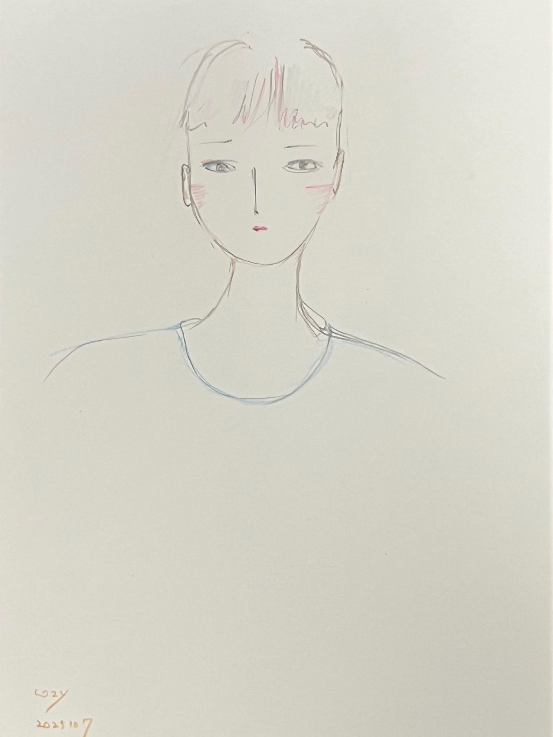 台湾の女子のつもりが 北海道の女性になってしまった 中々可愛いです。 サイズ 12.3×17.5センチ、ちょっとしたスペースでも映えるサイズ感 額装済み 画材 紙に色鉛筆 パイロットハイテック 製作年月日 2025年8月27日